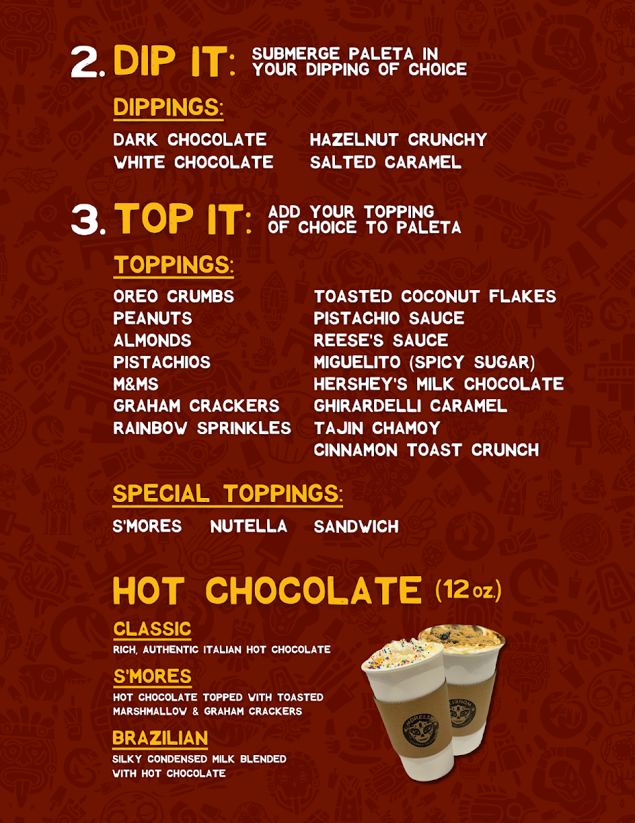 Dipping options such as Dark Chocolate and Salted Caramel elevate the experience, while toppings like Oreo Crumbs and Toasted Coconut add exciting textures. The friendly staff ensures a smooth selection process, making it the perfect spot for both kids and adults to satisfy their sweet cravings!